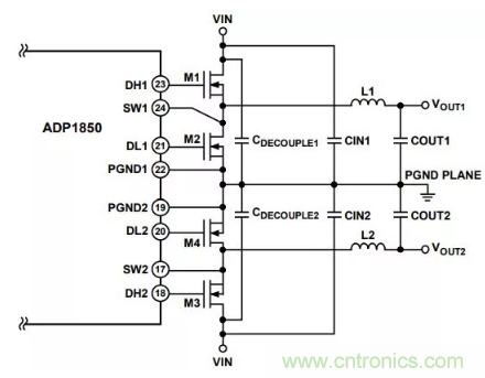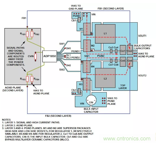 作為例子的開(kāi)關(guān)調(diào)節(jié)器布局采用雙通道同步開(kāi)關(guān)控制器 ADP1850,第一步是確定調(diào)節(jié)器的電流路徑。然后,進(jìn)行物理規(guī)劃和電源器件的考慮。此外,我們需要了解一點(diǎn):電流路徑?jīng)Q定了器件在該低噪聲布局布線設(shè)計(jì)中的位置。