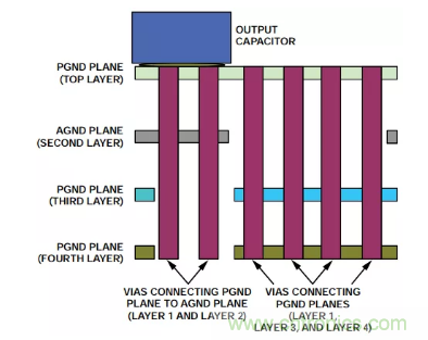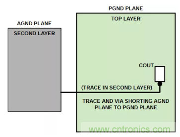 AGND層一路擴(kuò)展到輸出電容,AGND層和PGND層在輸出電容的負(fù)端連接到過(guò)孔。