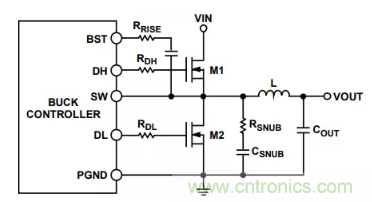 在DH或DL引腳上串聯(lián)一個(gè)小電阻(約2 Ω至4 Ω)可以減慢柵極驅(qū)動(dòng),從而也能降低柵極噪聲和過(guò)沖。另外,BST與SW 引腳之間也可以連接一個(gè)電阻(參見(jiàn)圖6)。在布局期間用0 Ω柵極電阻保留空間,可以提高日后進(jìn)行評(píng)估的靈活性。增加的柵極電阻會(huì)延長(zhǎng)柵極電荷上升和下降時(shí)間,導(dǎo)致 MOSFET的開(kāi)關(guān)功率損耗提高。