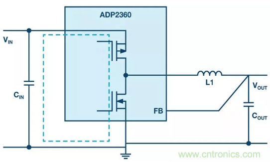 圖1:用于降壓轉換的開關穩(wěn)壓器(帶如虛線所示的關鍵熱回路)。