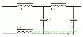 圖5是開關(guān)電源的直流輸出側(cè)濾波電路,它由共模扼流圈L1、L2,扼流圈L3和電容C1、C2組成。為了防止磁芯在較大的磁場強(qiáng)度下飽和而使扼流圈失去作用,磁芯必須采用高頻特性好且飽和磁場強(qiáng)度大的恒μ磁芯。