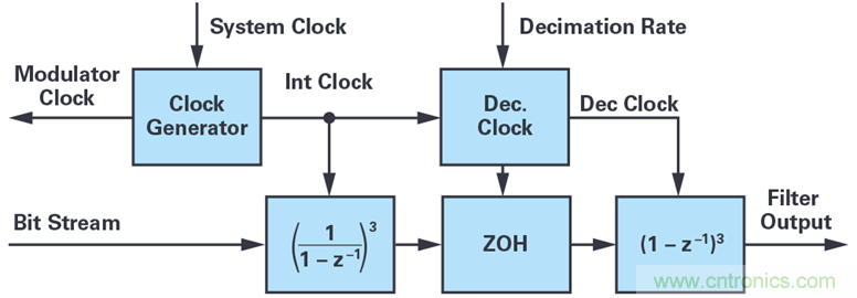 傳統(tǒng)的三階sinc濾波器如圖1所示。濾波器通過按比例縮放系統(tǒng)時鐘來生成ADC的調(diào)制器時鐘,而ADC則向?yàn)V波器返回一個1位數(shù)據(jù)流。濾波器功能本身包括三階級聯(lián)積分器 1/(1 – z–1)(時鐘速率與調(diào)制器速率相同)和三階級聯(lián)微分器 1 – z–1(時鐘速率為抽取時鐘)。