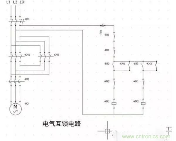 正反轉(zhuǎn)的控制回路只是在KM1的正轉(zhuǎn)回路上增加了一個KM2的常閉輔助觸點(diǎn),同時也在KM2的反轉(zhuǎn)回路上增加了一個KM1的常閉輔助觸點(diǎn),這就是所謂的互鎖電路