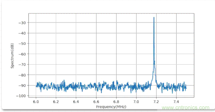 使用DSA815頻譜儀,加上單圈環(huán)形天線接收到的特斯拉線圈工作頻譜對(duì)應(yīng)的頻譜如下。其中諧振諧振頻譜為6.8225MHz。