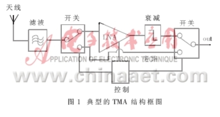 很多情況下,因?yàn)榛九c移動設(shè)備不平衡連接的緣故,從基站到移動設(shè)備的信號強(qiáng)度和傳輸距離都要超過移動設(shè)備向基站的反向傳輸,并且由于天線與基站間的反饋損耗,使得這種不平衡性變得更大。為了改善這種不平衡性,擴(kuò)大基站接收的覆蓋面,最直接的解決方案是加裝塔裝放大器TMA或Masthead放大器。而TMA中最重要的模塊LNA(如圖1所示)對接收的信號具有選頻功能,并把選頻后的信號進(jìn)行低噪聲放大,使系統(tǒng)靈敏度增強(qiáng),覆蓋半徑增大。