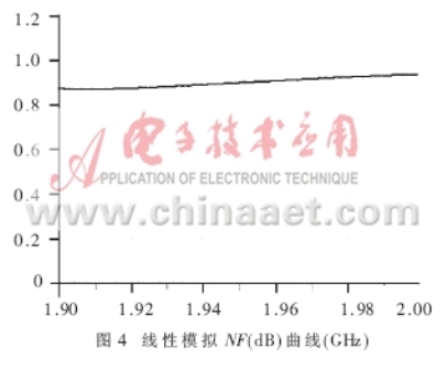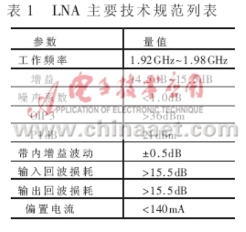 為使圖2中的LNA模塊噪聲系數(shù)。截點(diǎn)和增益達(dá)到表1中的各項(xiàng)指標(biāo),設(shè)計(jì)漏極電流Id=60mA?同時(shí),要求單個(gè)放大元件在此偏置點(diǎn)的工作性能達(dá)到優(yōu)于表1的規(guī)范值。由于E-pHEMT元件ATF-54143在電流Id=60mA下,具有最佳的截點(diǎn)(IP3)和最小噪聲系數(shù)Fmin;漏源極電壓Vds為3V時(shí),具有稍高的增益;偏置是+5V穩(wěn)定電壓,所需單極性+3V電壓更具有優(yōu)勢,因此選擇其作為放大元件。