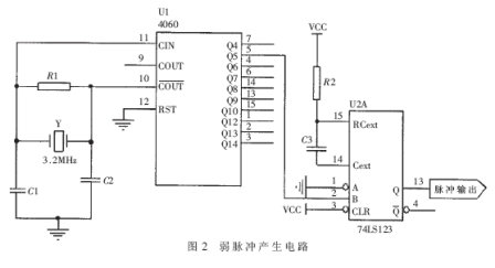 利用數(shù)字電路產(chǎn)生周期脈沖信號的方法有很多,本文采用的是利用方波發(fā)生器4060產(chǎn)生周期為20μs的方波信號,然后觸發(fā)單穩(wěn)態(tài)觸發(fā)器74LS123產(chǎn)生脈寬為50ns~150ns可調(diào)的脈沖周期信號。電路原理圖如圖2所示。