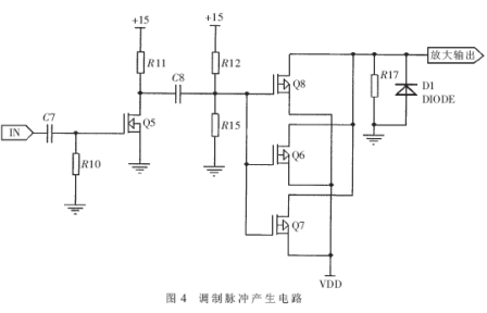 弱脈沖放大電路的輸出脈沖通過控制MOS管的通斷控制電容的充放電,從而形成符合要求的調(diào)制脈沖,驅(qū)動振蕩器工作。調(diào)制脈沖產(chǎn)生電路如圖4所示。