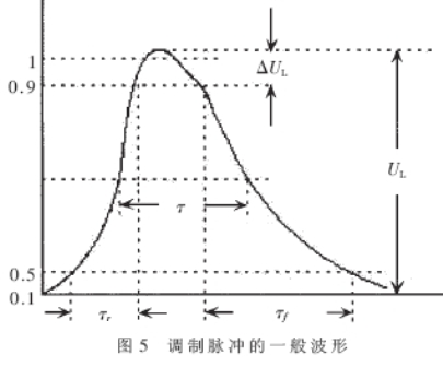 在理想情況下,脈沖調(diào)制器輸出的脈沖應(yīng)為矩形,矩形脈沖頂部平坦,脈沖持續(xù)期間雪崩管振蕩器的功率和頻率穩(wěn)定。但實際上,由于脈沖調(diào)制器中不可避免地存在有寄生參量,例如分布電容、引線電感等,而其上的電壓、電流又是不能突變的,這就使得脈沖調(diào)制器不可能輸出理想的矩形調(diào)制脈沖,一般脈沖波形如圖5所示。