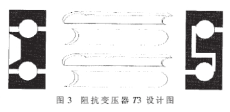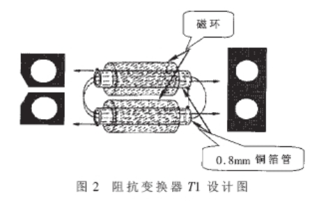 圖2中深色區(qū)域代表覆銅區(qū)域。銅箔管首先穿過(guò)磁環(huán)后再穿過(guò)兩端的銅膜板并焊接在一起,完成次級(jí)線(xiàn)圈。T2的設(shè)計(jì)基本與T1相似,只是使用同軸線(xiàn)SFF-1.5-1的芯線(xiàn)纏繞的初級(jí)線(xiàn)圈圈數(shù)不同而已。