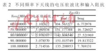 從文獻(xiàn)中可以查到本文所仿真的天線輸入電阻值約為150Ω,從文獻(xiàn)可以查到輸入電抗約為20Ω左右。實際上,不僅天線的輸入電抗與頻率有關(guān),而且不同頻率下輸入電阻也不同,利用仿真軟件可以比較準(zhǔn)確地得到這些參數(shù)。表2給出了幾種頻率下天線的輸入電阻與電抗值。從表2可以看出,仿真結(jié)果的輸入阻抗在工作頻帶內(nèi)與理論值有一定差別,隨著頻率接近天線頻率范圍的上下限,仿真結(jié)果與理論值相差越大。通過仿真計算所得到比較準(zhǔn)確的天線輸入阻抗,對于研究調(diào)制電路與天線的匹配問題有著非常重要的作用。