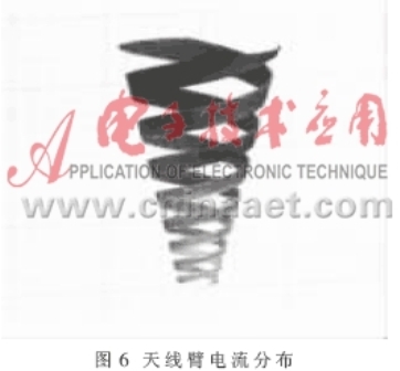 圖6表示頻率f=80MHz時電流在天線臂上的分布,可以看出傳導(dǎo)電流從天線饋電點(即圓錐頂部一端)流入,先經(jīng)過傳輸區(qū)(約下面的2圈),再向上是輻射區(qū)(約第3圈),最后為衰減區(qū)(后面幾圈)。在傳輸區(qū)內(nèi),電流大小變化不明顯,到達(dá)輻射區(qū)后,隨著大量能量以電磁波的形式傳播,電流迅速減小,最后經(jīng)過衰減區(qū),電流逐漸減小至零,這符合天線一般規(guī)律。其中,輻射區(qū)的位置與頻率有關(guān),即位于波長近似于圓錐截面周長的地方??梢韵胂螅煌l率會對應(yīng)不同的輻射區(qū)位置,這是CLS天線的工作特性,也是CLS天線具有寬帶特性的原因。