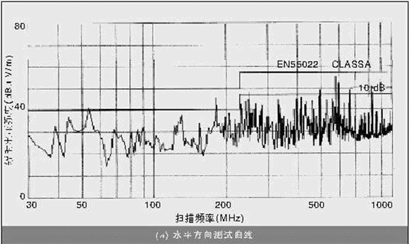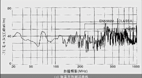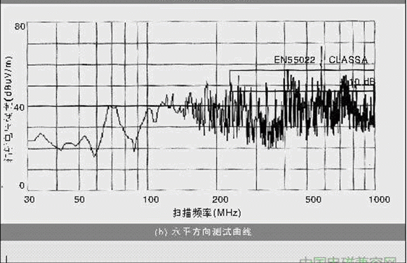 測試環(huán)境為電波暗室,測試設備為寬帶天線、頻譜分析儀和信號放大器,天線可以在1 m與4 m高度范圍內(nèi)升降,被測產(chǎn)品放置在一個可360°旋轉(zhuǎn)的平臺上,距離天線3 m。測量時轉(zhuǎn)動平臺,升降天線找到最大干擾,天線測量取水平和垂直兩種極化。