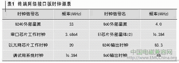因為終端網(wǎng)絡接口板上沒有412.5 MHz和577.5 MHz這兩個頻率信號,所以懷疑這兩個頻點可能是某些頻率信號的諧波分量。高速電路中,時鐘電流是第一輻射源。筆者對終端網(wǎng)絡接口板上的各時鐘信號進行了統(tǒng)計,如表1所示。