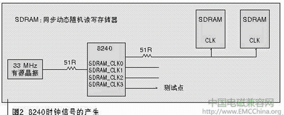 圖2所示為8240時鐘信號的產(chǎn)生原理圖。8240外部有源晶振產(chǎn)生33 MHz的振蕩頻率,送入8240芯片,經(jīng)內(nèi)部PLL(鎖相環(huán))鎖相倍頻,輸出83.3 MHz頻率,作為SDRAM(同步動態(tài)隨機讀寫存儲器)的工作時鐘,8240有4個引腳可以同時送出該83.3 MHz的時鐘:SDRAM_CLK0~SDRAM_CLK3,而且可以在8240內(nèi)部寄存器中設置開關(guān)。該單板在電路設計時,使用SDRAM_CLK0作為SDRAM工作時鐘,另一路SDRAM_CLK3送至一測試點,方便調(diào)試時測量時鐘信號,其余2路設置為關(guān)閉狀態(tài),不對外輸出時鐘。