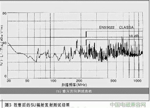 筆者用高速示波器測量出網(wǎng)絡接口板的工作地噪聲(Vp-p)為96 mV,中頻板工作后,噪聲增至130 mV以上。此測量方法可能存在偏差,但總體的趨勢是2塊單板同時工作后,的確增加了地線噪聲,對EMI有一定的影響,只不過影響是有限的。