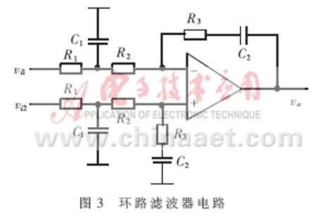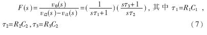 環(huán)路濾波器設(shè)計——環(huán)路濾波器形式和參數(shù)的選取是整個鎖相環(huán)電路設(shè)計與調(diào)試的關(guān)鍵。在壓控振蕩器和檢相器設(shè)計確定的情況下,環(huán)路濾波器的傳輸函數(shù)直接決定了整個環(huán)路的傳輸函數(shù),從而在很大程度上決定環(huán)路的噪聲性能、捕獲和跟蹤性能等。在鎖相環(huán)路設(shè)計中廣泛采用由有源比例積分濾波器組成的高增益二階環(huán)路,因為這種環(huán)路具有無條件穩(wěn)定性,而且有較大相位裕度。但是為了更好地抑制控制線中干擾、提高環(huán)路噪聲抑制性能,在高增益二階環(huán)的基礎(chǔ)上附加一級RC低通濾波器。其電路形式如圖3所示。