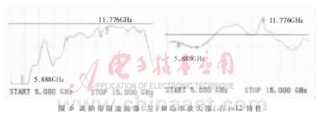 的連接線。濾波后采用低耗能的射頻放大器對信號進行功率放大以彌補濾波器的通帶衰減。功率放大器電路設(shè)計主要是隔直電路的設(shè)計,選用一級耦合微帶作為隔直電路,對11.776GHz信號增益可以達到10dB左右。圖6給出了用網(wǎng)絡(luò)分析儀測得的帶阻濾波器和功率放大器的s12特性。