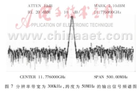 在整個鎖相頻率綜合器系統(tǒng),需要測量的電路單元主要有:分頻式鎖相環(huán)環(huán)路特性、高頻帶阻濾波器特性、高頻信號功率放大單元和整個頻率綜合系統(tǒng)的輸出頻譜特性。用Marconi 10kHz~1GHz信號發(fā)生器提供高精度46MHz參考信號,用HP8592A頻譜分析儀測量輸出信號頻率特性。頻譜結(jié)果如圖7所示,系統(tǒng)輸出信號頻率點在11.776GHz,系統(tǒng)輸出信號功率為3.64dBm。用同樣頻譜分析儀測量系統(tǒng)輸出信號的單邊帶相位噪聲。取偏離載頻為1kHz的測試波形,測得其單邊帶相位噪聲為-72.8dBc/Hz@1kHz。