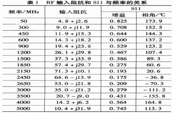 頻率大于1.2 GHz時,盡管放大器提供的功率有幾個dB,但最佳LD驅(qū)動功率只有-3 dBm(I/0輸入功率變化,混頻器性能不變);在頻率低于1.2GHz的情況下,盡管-3 dBm的L0驅(qū)動功率仍然提供高轉(zhuǎn)化增益和線性,但是為了得到最佳噪聲,LO驅(qū)動功率為0 dBm。自定義匹配網(wǎng)絡(luò)的阻抗數(shù)據(jù)見表2,并參考LO端沒有匹配時的情況。