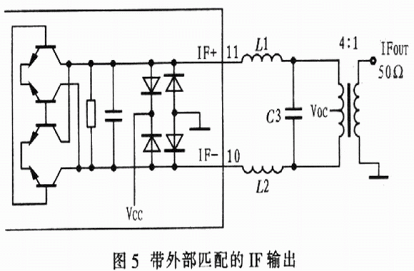 圖3示出由混合變壓器構(gòu)成的lF匹配電路,以達到最低LO-IF泄漏和最寬的IF帶寬。圖4示出由1個離散的IF不平衡變壓器代替IF變壓器的電路,以降低成本和縮小尺寸,盡管離散的IF不平衡變壓器也有較理想的噪聲系數(shù)、線性度及較高的轉(zhuǎn)換增益,但是LO-IF泄漏降低,IF的帶寬減小。