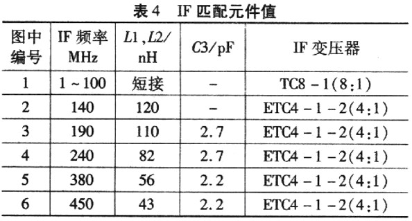 該匹配網(wǎng)絡(luò)對40MHz以上(包括40MHz)的IF最為合適。對于40 MHz以下的IF頻率,若串聯(lián)電感器(Ll、L2)的電感值取得過高,用這樣的電感和寄生效應(yīng)將影響穩(wěn)定性,因此,8:1變壓器適合于低IF頻率。適用于 IF頻率的低通濾波的匹配元件值如表4所示。高Q值線繞片式電感器(Ll、L2)大大改善了混頻器的轉(zhuǎn)換增益,但對線性度還是有點影響。