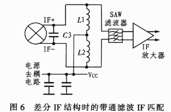 對整個差分IF結(jié)構(gòu)來說,還可以從另一個角度考慮,不用IF變壓器,如圖6所示,這里,混頻器的lF輸出匹配直接通過1個SAW濾波器,混頻器IF端的電源由IF匹配網(wǎng)絡(luò)中的電感器提供。計算Ll、L22和C3的值,使之在期望的IF頻率上諧振,并獲得高品質(zhì)因數(shù)和理想帶寬。調(diào)整L和C值,以消除混頻器內(nèi)部2.5 pF電容和SAW濾波器輸入電容的影響。在這種情況下,由于帶通網(wǎng)絡(luò)不變換阻抗,其差分lF輸出阻抗是400Ω。若SAW濾波器的輸入阻抗大于或小于 400 Ω,就需要附加匹配元件。