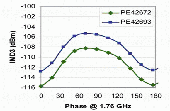 手機中增加的頻段越多,對開關(guān)的技術(shù)要求就越高,而且WCDMA的線性度和諧波要求對器件性能也帶來了很大的壓力。通過利用UltraCMOS制造工藝的線性優(yōu)勢,圖2中的單片PE42693 SP6T可以保持其前代SP7T開關(guān)+68dBm的IP3,而且IMD3性能超過業(yè)界標準的-105dBm(圖1)。