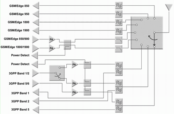 隨著多頻段架構(gòu)的普及,對功放和相關(guān)濾波器的數(shù)量提出了嚴格的要求。事實上,對功放的技術(shù)要求沒有變化,但手機設(shè)計需要使用更多的功放。因此真正改變的是需要一個特別高效的方法將所有射頻信號傳送給天線-單片開關(guān)。