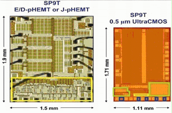 隨著多頻段手機越來越流行,對高集成度、小型天線開關(guān)的需求也越來越迫切。UltraCMOS SP7T開關(guān)現(xiàn)在已經(jīng)開始批量生產(chǎn),SP9T也在2007年底投入批量生產(chǎn)。在外形方面,GaAs SP7T為1.6x1.5mm,而采用SOS工藝SP7T開關(guān)只有1.2x1.0mm,面積縮小了一半。目前的GaAs E/D pHemt或J-pHemt SP9T開關(guān)外形尺寸為1.9x1.5mm。與之相比,采用UltraCMOS 0.5μm工藝制造的SP9T外形尺寸為1.7x1.1mm(圖3),它不需要片外ESD器件和性能增強匹配器件。UltraCMOS發(fā)展規(guī)劃預(yù)計0.25μm版本的SP9T尺寸將達到1.32x1.29mm。