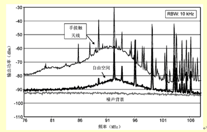 最后,要注意人體對(duì)小天線在FM調(diào)頻頻帶的增益的影響是正面的,尤其是使用者的身體與天線或者底板接觸的情況下。這是因?yàn)椋?00MHz左右,人體是效率相當(dāng)好的天線,半波長(zhǎng)是1.5m左右。圖3給出了人體接觸天線和沒有接觸天線時(shí),接收天線的輸出頻譜。很明顯,用手接觸天線時(shí),G/T提高了10~15dB。由于大多數(shù)使用者在聽電話時(shí)和移動(dòng)電話是靠得很近的,所以可以合理地假定,F(xiàn)M調(diào)頻天線的實(shí)際性能優(yōu)于它處在自由空間時(shí)的性能。
