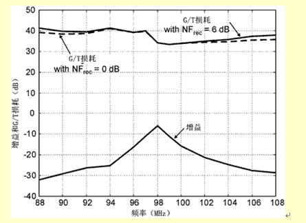 由現(xiàn)場(chǎng)測(cè)試可知,在接收FM調(diào)頻信號(hào)時(shí),ActivvTM有源天線的性能相當(dāng)于耳機(jī)連接線型天線,雖然這兩種天線的尺寸有很大差別??紤]到有源天線的體積小,它的幅射電阻大約只有1mΩ,而寄生損失電阻至少有1Ω左右,增益在-30~-50dBi的范圍內(nèi)。對(duì)于大多數(shù)RF工程師來講,這樣的增益是很難接受的。但是有一個(gè)因素極大地放寬了接收FM調(diào)頻信號(hào)時(shí)對(duì)增益的要求,即很高的環(huán)境噪聲溫度。圖8是一個(gè)消聲室(為了得到保守的估計(jì))在屏蔽裝置拿走后的噪聲電平。大多數(shù)無線系統(tǒng)工作在頻率高于1GHz的范圍,環(huán)境噪聲接近室溫,增益為-10dBi,相當(dāng)于信噪比降低了10dB,在FM頻段內(nèi),在城市的大部分地區(qū),由于人為噪聲的影響,噪聲電平高了大約20dB(對(duì)于調(diào)幅會(huì)更高)。因此,與完美的雙極電線相比,效率差的天線收到的信號(hào)較弱,噪聲較小。圖9給出了增益不同(0、-20、-40dB)的三種天線不同噪聲溫度時(shí)的G/T值。所有三種天線都接到噪聲指數(shù)為6dB的接收器上。對(duì)于增益為-40dB的實(shí)際天線(在室溫下G/T值減少46dB),當(dāng)情況相同時(shí),在23.000K的典型溫度下性能提高了19dB。對(duì)于有源天線,通過壓制接收器的噪聲指數(shù),可以把性能再提高6dB。所以,從信噪比方面看,增益為 -40dB的無源天線,只比完美的雙極天線差27dB。
