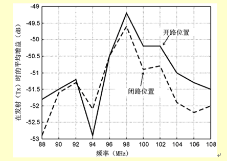 在發(fā)射時(shí),發(fā)射元件起標(biāo)準(zhǔn)的無源天線作用,它用一個(gè)單刀單擲(SPST)通斷控制進(jìn)行連接(見圖4)。前置放大器處在Rx狀態(tài),仍然與天線連接(但是切斷電源)。用一個(gè)內(nèi)阻為50Ω的信號(hào)源供給信號(hào)時(shí),失配的半圈天線的增益測(cè)定值如圖7所示。寬帶范圍的平均增益(或者效率)達(dá)到-53~-49dB。在開關(guān)和調(diào)頻發(fā)射組件之間接入一個(gè)匹配網(wǎng)絡(luò),或者選擇適當(dāng)?shù)墓Ψ泡敵鲎杩?,那么?duì)輸出功率的要求可以放寬很多。