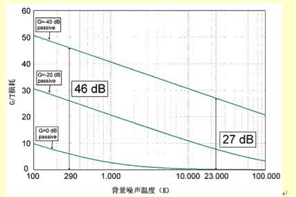 在實(shí)際應(yīng)用中,除了受天線特性的影響,有兩個(gè)外來的因素會(huì)影響G/T損失的數(shù)值:接收器的噪聲指數(shù)和環(huán)境噪聲溫度Ta。接收器的噪聲指數(shù)會(huì)增大天線的輸出噪聲Tout(因而降低G/T),環(huán)境噪聲溫度也會(huì)增大輸出噪聲。