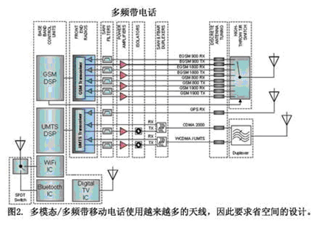 很早就在向各個方向發(fā)送信號的固定系統(tǒng)中觀察到干擾,例如WiFi,當具有同樣能量和頻率的兩個發(fā)送器相互靠攏時就會產(chǎn)生干擾。通常采用時間分配、定向發(fā)送、多樣化和/或跳頻來解決這個問題。但移動電話的設(shè)計遠沒有這樣高的靈活性,這是因為器件的移動性和存在不可預(yù)測的其它干擾源,比如移動電話、局域網(wǎng)和藍牙等,以及小尺寸的移動電話和高接收靈敏度的要求。使用超高Q過濾(SAW、FBAR和/或空腔)來保護接收器免受干擾,并且清理發(fā)送以盡可能地降低產(chǎn)生干擾的可能性。不幸的是,這要求每個工作模式/頻段都至少有一對額外的固定濾波器,這會增大移動電話的成本和尺寸。這些濾波器所要過濾的信號可能來自于同一平臺的其它天線,但是鄰近的天線之間可能產(chǎn)生相互干擾(圖3)。密集的天線可能會引起天線到天線的直接耦合,這就需要更嚴格的濾波器規(guī)范,從而使濾波器的復雜度和成本上升。如果天線與RF路徑耦合,那么固定濾波器可能很難起作用,因為濾波器是無法與RF路徑隔離的,但是PCB屏蔽層有助于將這種耦合效應(yīng)降到最低。