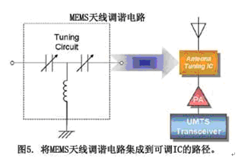 天線調(diào)諧器件的一種應(yīng)用方法是采用一個諧振或阻抗可調(diào)(RLC)電路,以使可變電容能夠調(diào)節(jié)功率放大器和天線之間的復雜阻抗?;镜姆椒ㄈ鐖D5所示,其中通過RF-MEMS技術(shù)將可調(diào)電容和精確電感集成到一起。