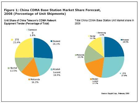 圖1所示為iSuppli公司對2008年中國電信的CDMA布署B(yǎng)TS市場份額,以及全國CDMA市場的預(yù)測。