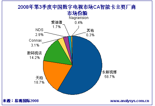 永新視博以58.7%的過半市場(chǎng)份額保持絕對(duì)領(lǐng)先,較上季度市場(chǎng)份額上升了15個(gè)百分點(diǎn),而天柏和數(shù)碼視訊分別發(fā)卡67萬和51萬,都比上期有不少程度的下降。