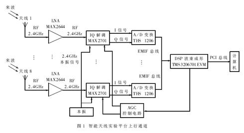為了開展智能天線技術(shù)研究,結(jié)合實際情況,筆者設(shè)計了一個基于TI公司TMS320C6701數(shù)字信號處理器的智能天線實驗平臺。該平臺采用8單元天線陣列,工作頻率為2.4GHz,采樣速率為1.5MHz,采用TI公司的TMS320C6701EVM作為數(shù)字波束成形和控制算法實現(xiàn)單元,用于在實際信號環(huán)境下智能天線控制算法測試、MIMO技術(shù)研究和其他陣列信號處理技術(shù)的研究。實驗平臺的上行通道如圖1所示,下行通道如圖3所示。