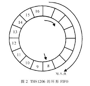THS1206內(nèi)部的FIFO安排成環(huán)形,采用讀取點、寫入點和觸發(fā)點控制讀寫操作,如圖2所示。芯片的轉(zhuǎn)換時鐘CONV_CLK控制采樣保持和A/D變換,CONV_CLK讓四個通道的信號同時采樣保持,然后分別轉(zhuǎn)換為數(shù)字信號并自動順序?qū)懭隖IFO,同時FIFO的寫入點向前移動,指示下一個寫入點;當FIFO內(nèi)的數(shù)據(jù)達到預定的觸發(fā)深度時,發(fā)出數(shù)據(jù)就緒信號DATSA_AV發(fā)出,DSP讀取轉(zhuǎn)換數(shù)據(jù),同時清除DATA_AV信號,讀取點和觸發(fā)點向前移動。芯片的工作方式由兩個寄存器控制,通過寫寄存器,可以選擇使用通道、工作模式、FIFO觸發(fā)深度、DATA_AV的極性與觸發(fā)方式等。