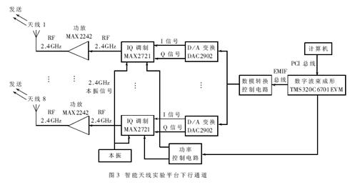 圖3給出智能天線實驗平臺下行通道的框圖。待發(fā)送數(shù)據(jù)由計算機通過PCI總線傳給C6701EVM評估板,C6701DSP根據(jù)波束成形的需要生成各通道所需的數(shù)字基帶I/Q信號;D/A變換器DAC2902把數(shù)字基帶I/Q信號變成模擬I/Q信號,為了保持各通道信號的相位關(guān)系,各路D/A變換器采用統(tǒng)一的時鐘啟動D/A變換,各路D/A變換器的控制信號由D/A變換控制電路產(chǎn)生;各通道模擬I/Q信號由零中頻I/Q調(diào)制器MAX2721上變頻到2.4GHz的射頻信號,經(jīng)過功率放大器MAX2242放大后送到天線陣列輻射,形成下行波束;各通道I/Q調(diào)制器所需的本振信號由統(tǒng)一的信號源產(chǎn)生以保證各通道的相位關(guān)系;C6701EVM通過McBSP發(fā)送命令到功率控制電路產(chǎn)生控制信號到MAX2721的功率控制端,控制天線陣列的輸出功率。[page]