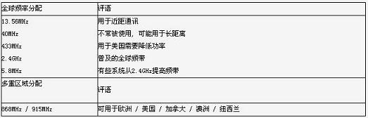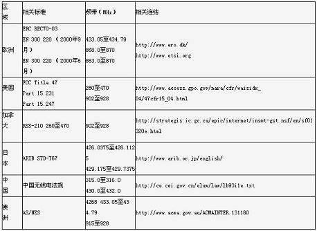 SRD無(wú)線系統(tǒng)的設(shè)計(jì)者在選擇無(wú)線通信頻率上需要格外小心。在大多數(shù)的情況下,此選擇被侷限于頻譜中容許免執(zhí)照使用的那些部份,而前提是必須符合使用上的特定規(guī)格與條件。表一所列為全球可使用的頻帶。
