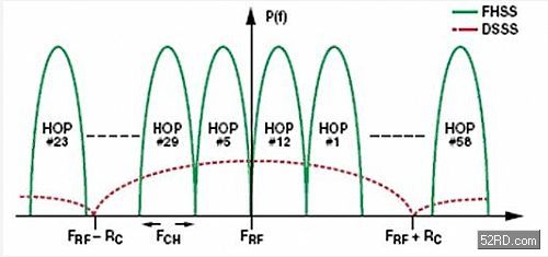 除了FHSS,直接展頻(DSSS)也被新的歐洲法令所納入,在DSSS系統(tǒng)中,窄帶的信號(hào)被乘上一高速虛擬亂數(shù)(PRN)序列,以產(chǎn)生出展頻信號(hào)。每一個(gè)PRN脈沖稱為一個(gè)"chip",而序列的速率則是叫作"chiprate"。至于原始窄帶信號(hào)所能展開的程度,則是稱之為處理增益(processinggain),此為chiprate(RC)對(duì)窄帶資料符號(hào)率(narrowbanddatasymbolrate)的比值。圖二所示為FHSS與DSSS的比較。