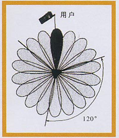 (1)波束轉(zhuǎn)換智能天線波束轉(zhuǎn)換智能天線具有有限數(shù)目的、固定的、預(yù)定義的方向圖,它利用多個(gè)并行窄波束(15°~30°水平波束寬度)覆蓋整個(gè)用戶區(qū),每個(gè)波束的指向是固定的,波束寬度也隨天線元的數(shù)目而確定(見(jiàn)圖2)。波束轉(zhuǎn)換系統(tǒng)實(shí)現(xiàn)比較經(jīng)濟(jì),與自適應(yīng)天線相比結(jié)構(gòu)簡(jiǎn)單,無(wú)需迭代,響應(yīng)快、魯棒性好。但預(yù)先設(shè)計(jì)好的工作模式有限,窄波束的特性將極大地影響系統(tǒng)性能。