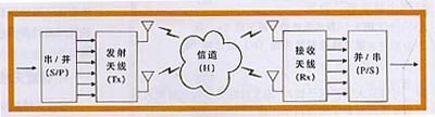 移動(dòng)通信環(huán)境中存在多個(gè)散射體、反射體,在無(wú)線通信鏈路的發(fā)射與接收端存在多條傳播路徑,多徑傳播對(duì)通信的有效性與可靠性造成了嚴(yán)重的影響。研究表明,可以利用多徑引起的接收信號(hào)的某些空間特性實(shí)現(xiàn)接收端的信號(hào)分離。多輸入一多輸出(MIMO)技術(shù)在通信鏈路兩端均使用多個(gè)天線,發(fā)端將信源輸出的串行碼流轉(zhuǎn)成多路并行子碼流,分別通過(guò)不同的發(fā)射天線陣元同頻、同時(shí)發(fā)送,接收方則利用多徑引起的多個(gè)接收天線上信號(hào)的不相關(guān)性從混合信號(hào)中分離估計(jì)出原始子碼流(見(jiàn)圖4)這相當(dāng)于頻帶資源重復(fù)利用,可以在原有的頻帶內(nèi)實(shí)現(xiàn)高速率的信息傳輸,使頻譜利用率和鏈路可靠性極大的提高。MIMO系統(tǒng)提供分集增益(diversitygain)和復(fù)用增益(multiplexinggain)。