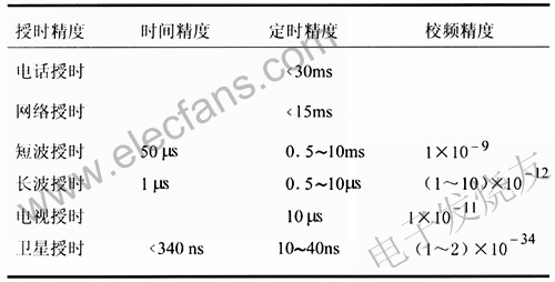 衛(wèi)星授時GPS導航系統(tǒng):提供的時間信號對世界協(xié)調(diào)時跟蹤,精度優(yōu)于100ns。GPS全球覆蓋,接收設備體積小,可以接收6顆衛(wèi)星信號,可用來提供2.048Mbit/s基準時間信號。俄羅斯的GLONASS衛(wèi)星導航系統(tǒng):目前系統(tǒng)未完成完善,接收設備商業(yè)化不夠。中國的北斗導航系統(tǒng):精度達到50ns,目前覆蓋中國,同步衛(wèi)星信號接收設備體積較大,系統(tǒng)還未建成。(3)網(wǎng)絡授時:通過互聯(lián)網(wǎng)授時。使用NTP(NetworkTimeProtocol,網(wǎng)絡時間協(xié)議,RFC1305)。(4)電話授時:通過公共電話網(wǎng),用戶用調(diào)制解調(diào)器接首時間信號。(5)電視授時:通過電視網(wǎng)授時。(6)電信有線傳輸網(wǎng)授時表1是授時精度比較表1