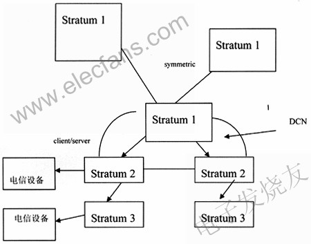 本地網(wǎng)級的Stratum1時間服務器之間互相聯(lián)網(wǎng),以symmetric方式互相校時,避免GPS時間源出故障造成中斷,還可以達到更高精度。Stratum1時間服務器對下級采用client/server方式。Stratum1時間服務器取得GPS時間信號和其他授時方式時間信號,比如其他導航衛(wèi)星,短波,長波方式,互為備用。上下級Stratum采用DCN相連或?qū)>€相連,保持穩(wěn)定相連。各級時間服務器把時間信號發(fā)到各個通信設備,如圖3所示。