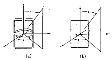 如圖2(a)所示。此處我們選擇螺旋中心為原點(diǎn),螺旋軸為Z軸,頂面和底面上天線臂的平行線為Y軸來建立坐標(biāo)系,另外柱面上的螺旋部分近似用直線和半圓的組合來代替,圖中的實(shí)箭頭表示電流方向,虛箭頭表示圓上電流的矢量和。顯然該模型可更進(jìn)一步簡(jiǎn)化為圖2(b)所示的一個(gè)YZ平面上的電流環(huán)和一個(gè)X軸上的電偶極子的組合。同樣跟它垂直的另一付雙臂螺旋天線亦可等效成一個(gè)XZ平面上的電流環(huán)和一個(gè)Y軸上的電偶極子的組合。根據(jù)天線的基本原理,由于這兩組電流環(huán)和電偶極子互相垂直且相差90°,那么在遠(yuǎn)區(qū)得到的是一個(gè)寬波束的心臟形圓極化方向圖。