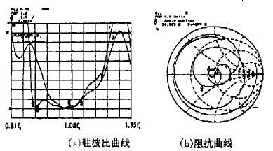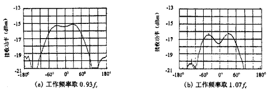 其中λC表示中心頻率對(duì)應(yīng)的波長。最后得到該天線的實(shí)測(cè)結(jié)果如圖3、圖4所示。圖3(a)中的曲線1表示在HP8510B矢量網(wǎng)絡(luò)分析儀上測(cè)得的四臂螺旋天線的駐波比特性曲線,為了便于比較,在同樣條件下測(cè)得的八臂螺旋天線駐波比由曲線2給出,可見八臂螺旋能明顯地展寬天線的頻帶;圖3(b)表示在相同的儀器上測(cè)得的史密斯阻抗圓圖。此處我們根據(jù)要求將天線的頻帶設(shè)計(jì)在14%,而事實(shí)上可以做得更寬。圖4(a)和(b)分別為工作頻率取0.93fc和1.07fc(即圖3(a)中的標(biāo)記2和3)時(shí),由頻譜儀測(cè)出的遠(yuǎn)區(qū)輻射方向圖,它們的半功率寬度分別達(dá)到140°以及145°左右,這么寬的波束是其它形式的天線很難達(dá)到的。