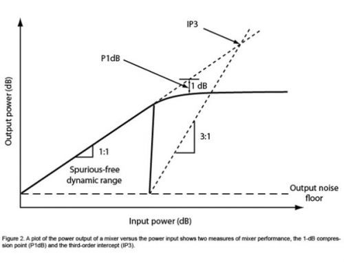 在標準或線性工作條件下,混頻器的變頻損耗是恒定的,與RF功率無關。這意味著,當你以1dB的幅度增加輸入功率時,輸出功率也會以1dB遞增。在P1dB壓縮點,輸入功率增加,以便輸出不隨輸入功率線性增加。這也是混頻器變頻損耗高出理想值1dB的原因(圖2)。